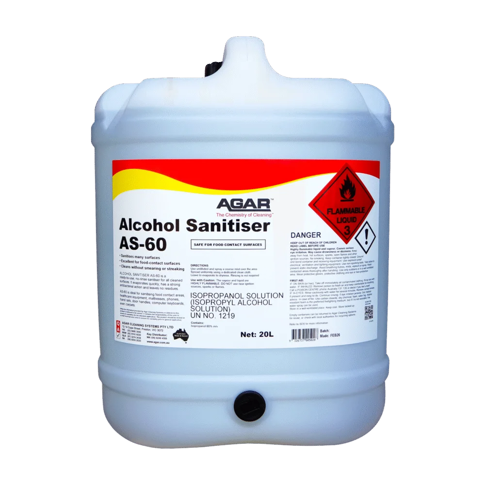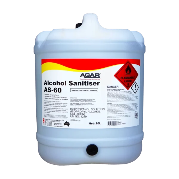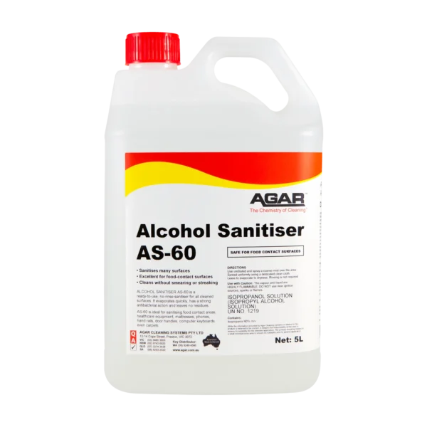 AS-60 has the ability to kill micro-organisms such as bacteria, fungi and many viruses by denaturing their proteins and dissolving their lipids (fatty materials). It is however not effective on bacterial spores. This germ-killing power makes AS-60 an excellent sanitiser for food-processing surfaces, door handles, taps, door touch-plates, toilet seats and other human contact surfaces. For maximum effectiveness, the surfaces should first be cleaned with an Agar detergent to remove bulk soilage before AS-60 is applied.