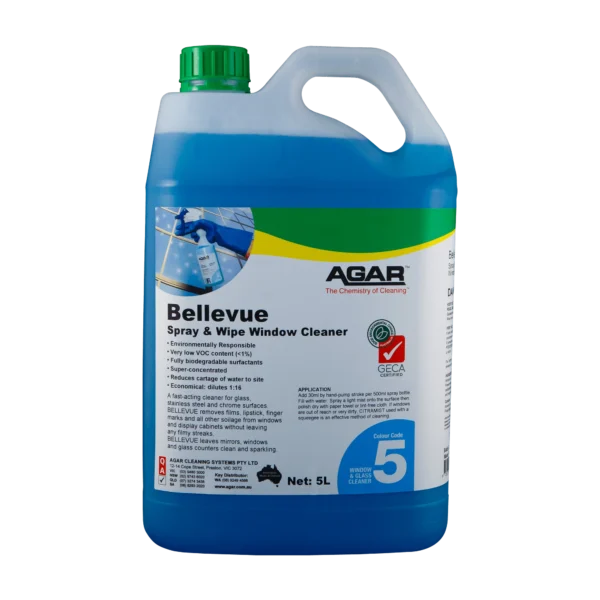 BELLEVUE contains surfactants that are derived from naturally renewable, regrowable resources (such as coconut oil, starch and sugar). No VOCs (volatile organic compounds) that can cause poor air quality, air pollution and potential allergic reactions in some individuals. NO perfumes or alcohols NO toxic, harmful or ecologically suspect ingredients: no ammonia, glycol ethers, nonyl phenol ethoxylates, caustics, corrosives, chlorine, heavy-metal sequestering agents or phthalates. BELLEVUE containers will be cleaned and reused if returned to Agar Cleaning Systems Pty Ltd., significantly reducing plastic usage and waste. They can also be recycled.