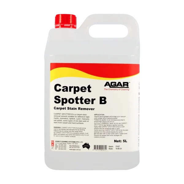 CARPET SPOTTER B is a carpet-stain removal solvent suitable for adhesive tape marks, cosmetics, lipstick, Lysol, mascara, nail polish, some types of ink stain and oil stain.