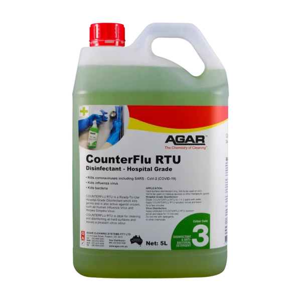 COUNTERFLU RTU is a Hospital Grade Disinfectant which kills germs and viruses such as Human Influenza Virus, Herpes Simplex Virus and Coronaviruses including SARS-CoV-2 (COVID-19 virus). It can be used to clean and disinfectant all hard surfaces.