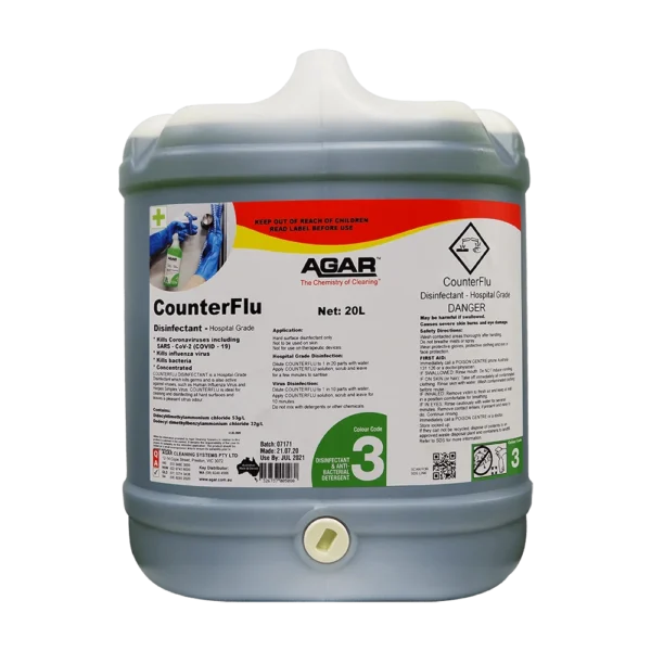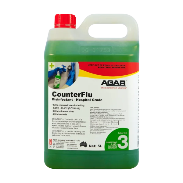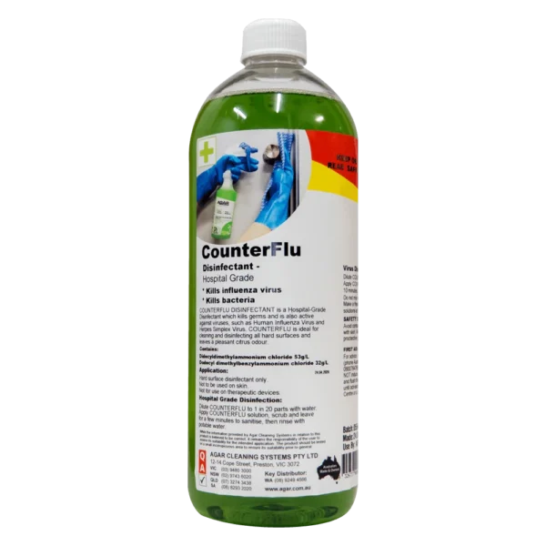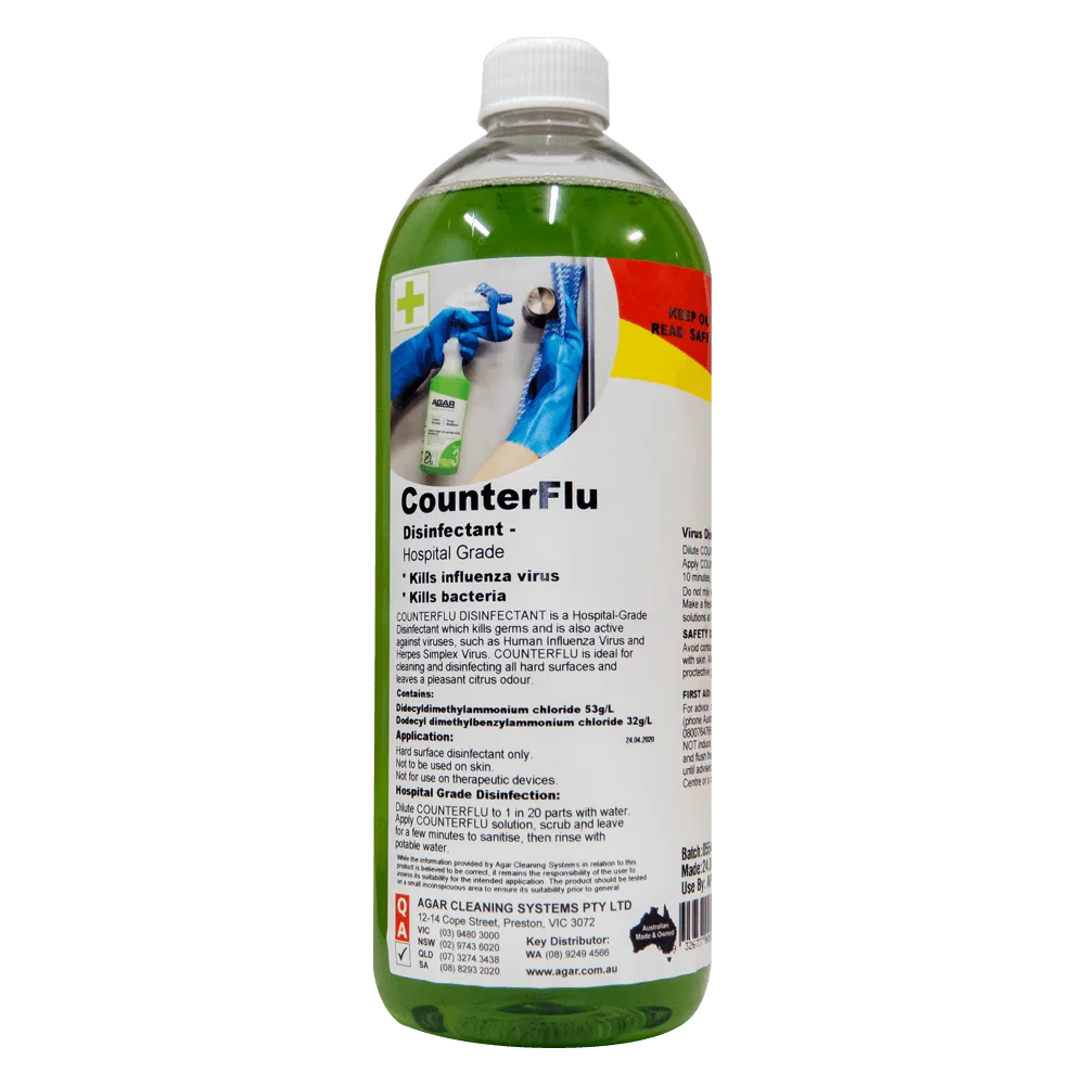 COUNTERFLU is a hospital-grade disinfectant with a powerful cleaning action that kills viruses including COVID-19 virus and flu virus, germs, bacteria, fungi and moulds.