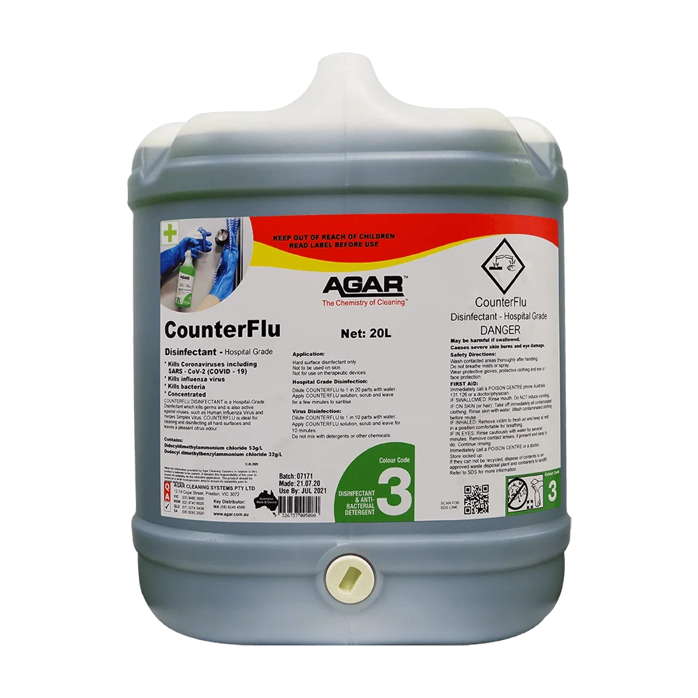 COUNTERFLU is designed to be diluted with water and used to clean and disinfect all hard surfaces. COUNTERFLU is also effective against many fungi and moulds.