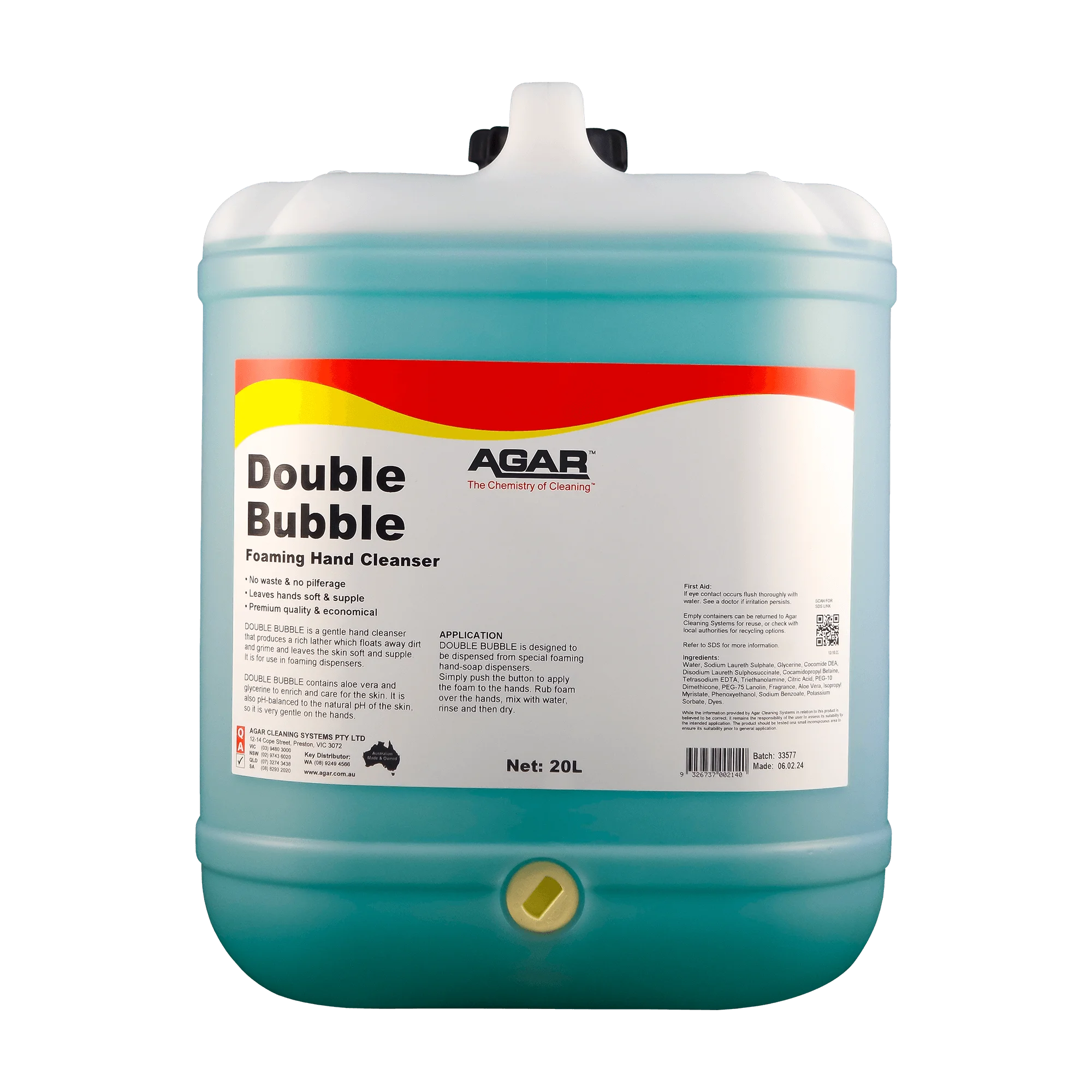 DOUBLE BUBBLE instantly produces a rich lather that floats away dirt and grime from the hands and leaves the skin soft and supple. DOUBLE BUBBLE contains aloe vera, wheat germ oil and glycerine to enrich and care for the skin.