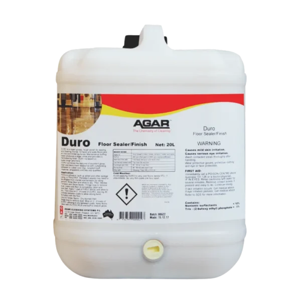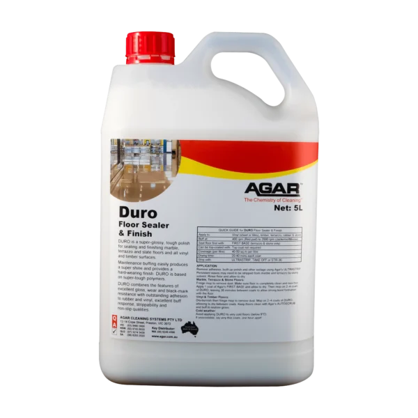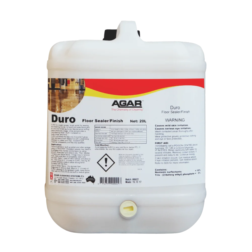 DURO has been developed for sealing marble and terrazzo floors as well as vinyl tiles, vinyl sheets, and timber floors; therefore, DURO is a polish with great versatility. On vinyl, DURO provides superior gloss and wear levels together with a high degree of buffability – this is an unusual combination for such a hard, tough polish. Field tests on vinyl tile floors have shown that DURO raises the level of floor appearance right through the day. DURO may be buffed with all buffing machines from 400 to 2500rpm. DURO is a non-slip coating.