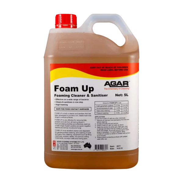 FOAM UP is a liquid cationic detergent sanitiser with ingredients to lift and emulsify fats and oils (non-ionic surfactants), soften water and kill germs (quaternary ammonium compound). FOAM UP is effective at destroying a wide range of gram-positive and gram-negative bacteria as well as moulds and fungi. It is a low toxicity product and is stable to light and heat.