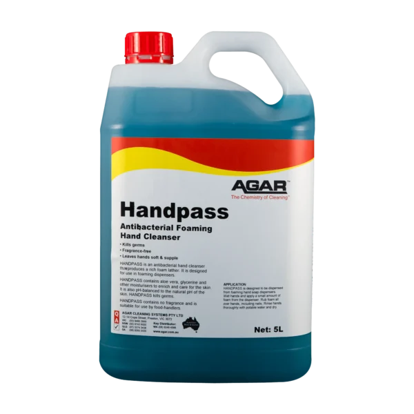 HANDPASS is a gentle hand cleanser for use in offices, washrooms and factories where moderate to light soilage must be washed from the hands. HANDPASS has no fragrance and is suitable for use by food-handlers.