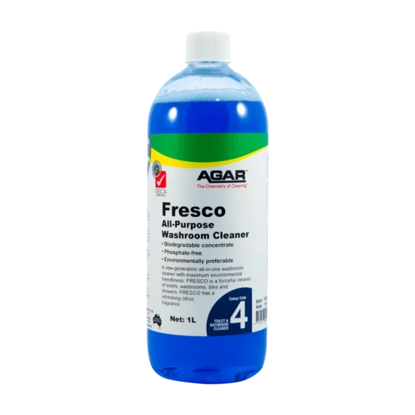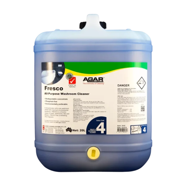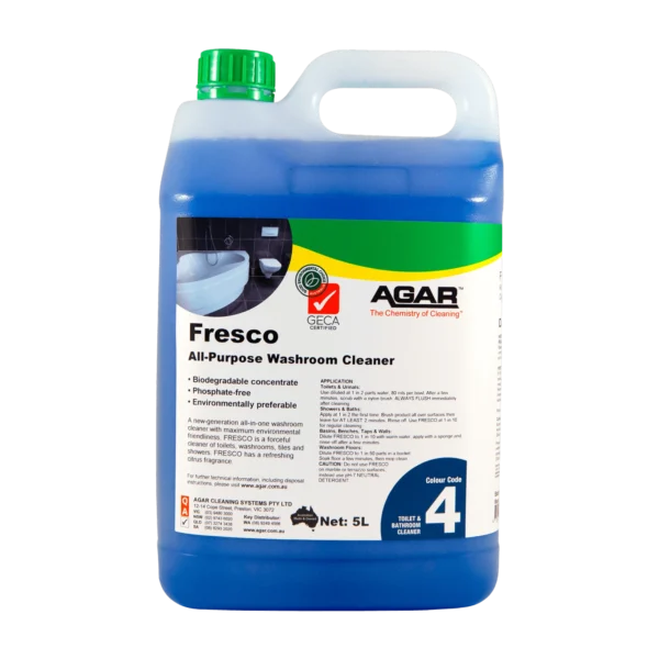 FRESCO is an all-purpose washroom cleaner. Used neat, it is a forceful cleaner of toilets, urinals and showers. Diluted, it is ideal for washroom floors, walls, basins and fixtures. FRESCO’s lime oils deodorise the washroom and leave a fresh lingering fragrance.