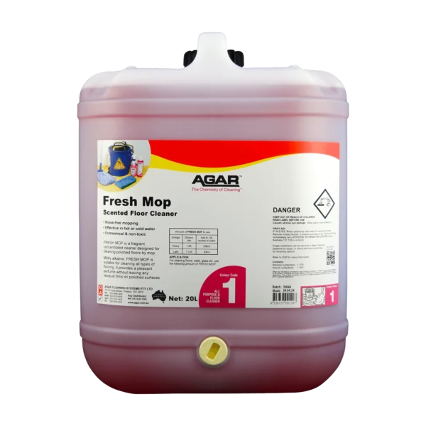 FRESH MOP is a lemon-scented mildly alkaline cleaner that will remove fats, oils, dirt, spillages, vehicular road dirt, floor traffic, soilage and spills of all kinds.