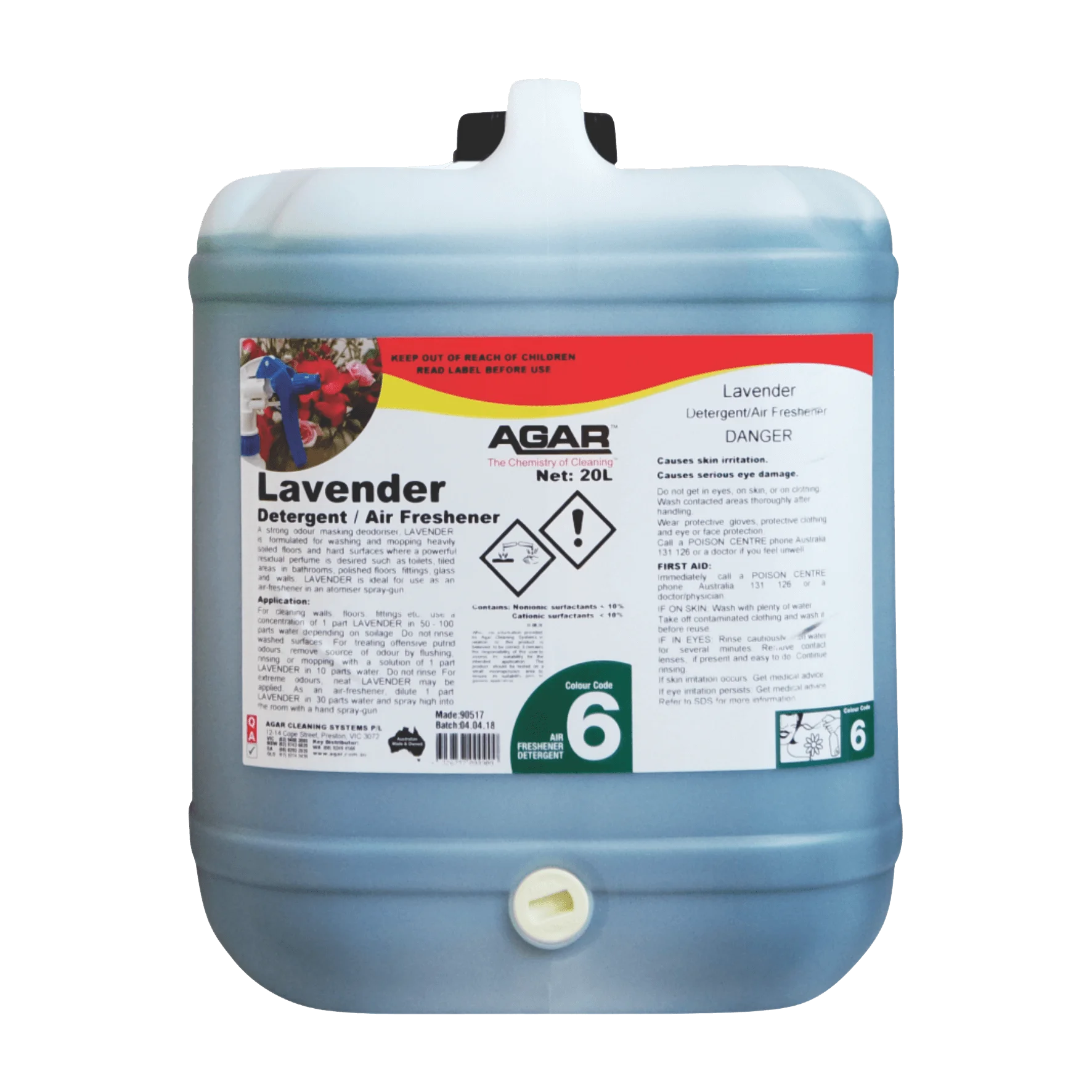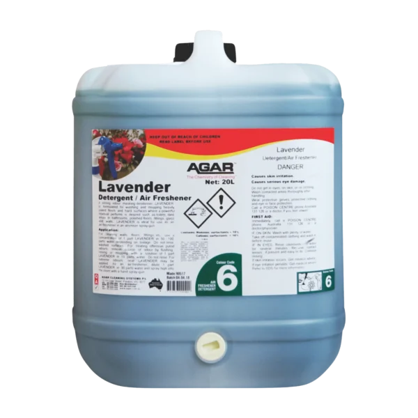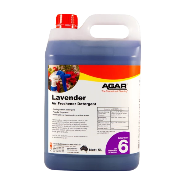 LAVENDER is a strong odour-masking detergent with the cleaning action needed to remove offensive and putrid soilage matter. It has a lavender perfume and is ideal for washing and mopping contaminated floors and hard surfaces including polished floors, tiles, fittings, glass and walls. LAVENDER is ideal for use as an air-freshener where a reodorant is required. The perfume in