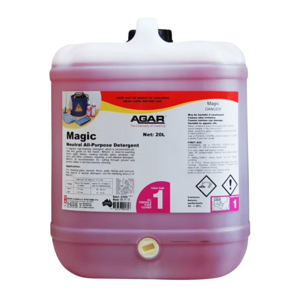 MAGIC is a concentrated, high-foam, neutral cleaner. This highly active cleaner, dilutes up to 1 in 400. It suspends dirt and soil, ripping through fatty residues, and can’t be beaten for dishwashing, remaining gentle on hands.