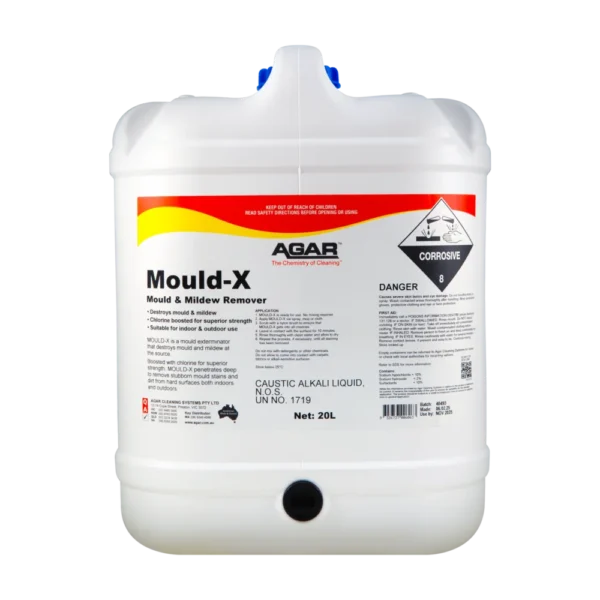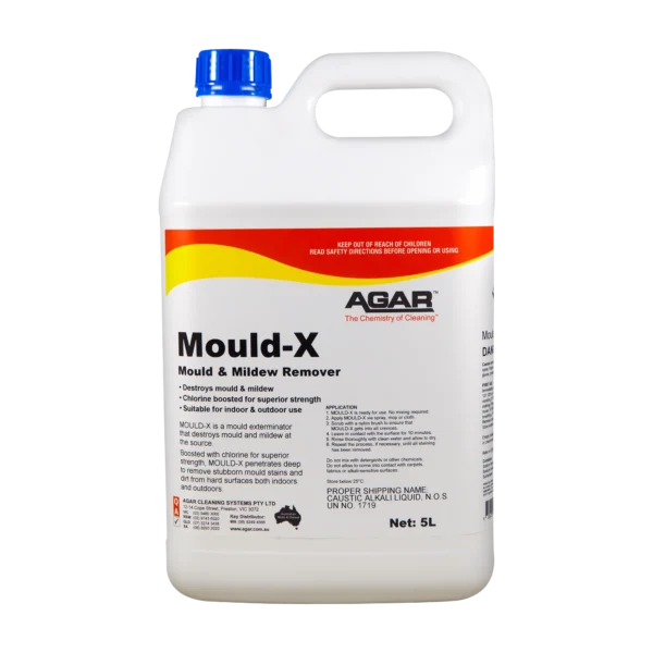 MOULD-X contains available chlorine which is present in solution in the form of sodium hypochlorite and hypochlorous acid. Hypochlorous acid is a powerful germ-killing agent which kills mould and mildew. MOULD-X also contains caustic alkali and detergents to provide an excellent cleaning action.