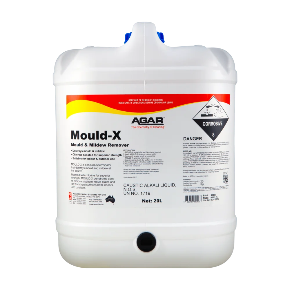 MOULD-X contains available chlorine which is present in solution in the form of sodium hypochlorite and hypochlorous acid. Hypochlorous acid is a powerful germ-killing agent which kills mould and mildew. MOULD-X also contains caustic alkali and detergents to provide an excellent cleaning action.