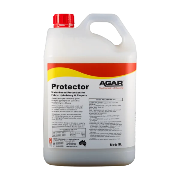 Based on Fluoropolymer technology, PROTECTOR is a fabric protection treatment designed for spray application. PROTECTOR is a water-based product. PROTECTOR puts an invisible barrier to soil and stain penetration around carpet and fabric fibres. Spillages can be vacuumed up or sponged off easily leaving the carpet clean and fresh. Being a water-based product, this PROTECTOR takes from 4 to 6 hours to dry, depending on temperature, humidity, fibre density and rate of application. It is an air-cured product which reaches a high level of stain repellency when it dries and continues to develop more repellency over the following weeks. If possible, the carpet should be left to dry for 24 hours before use. The high repellency provided by PROTECTOR will enable liquid spills to be blotted up before a stain occurs.