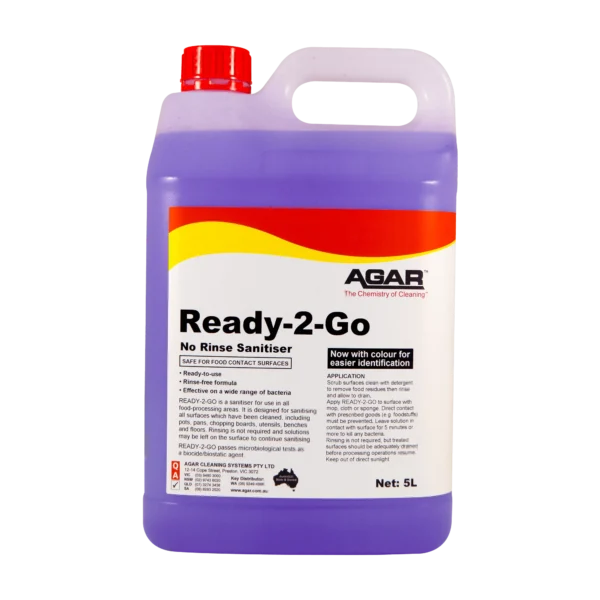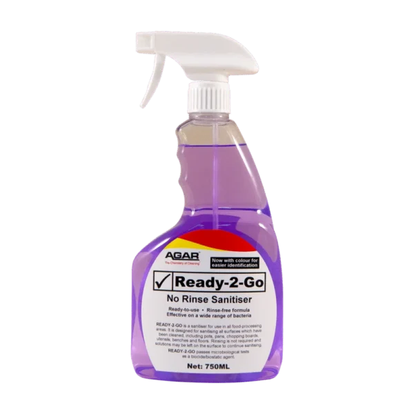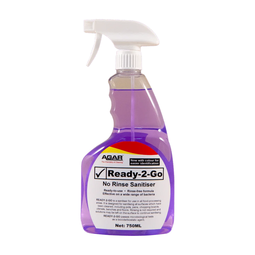 READY-2-GO is ready-to-use sanitiser for use in all food processing areas. It is designed for sanitising all surfaces which have been cleaned, including pots, pans, chopping boards, utensils, benches and floors.