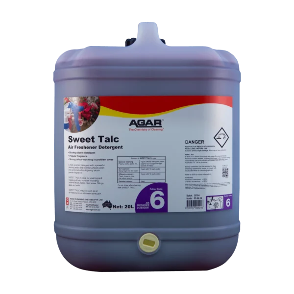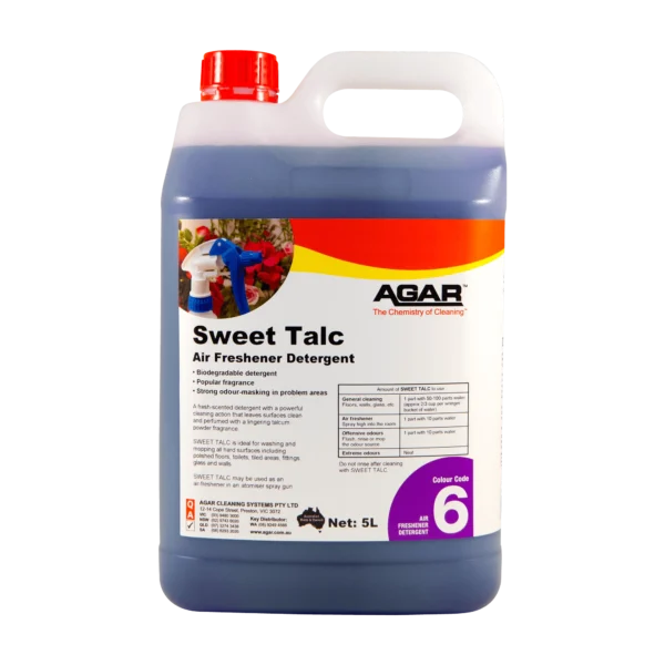 SWEET TALC is a lingering, fresh-scented detergent with a powerful cleaning action that leaves surfaces clean and perfumed with a pleasant baby powder fragrance. It is ideal for washing and mopping all hard surfaces including polished floors, tiled areas, fittings, glass and walls. SWEET TALC is also ideal as an air freshener in a spray bottle.