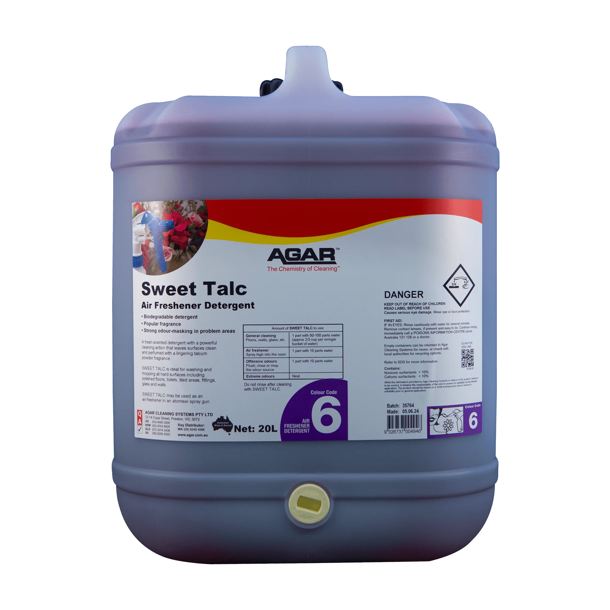 SWEET TALC is a lingering, fresh-scented detergent with a powerful cleaning action that leaves surfaces clean and perfumed with a pleasant baby powder fragrance. It is ideal for washing and mopping all hard surfaces including polished floors, tiled areas, fittings, glass and walls. SWEET TALC is also ideal as an air freshener in a spray bottle.