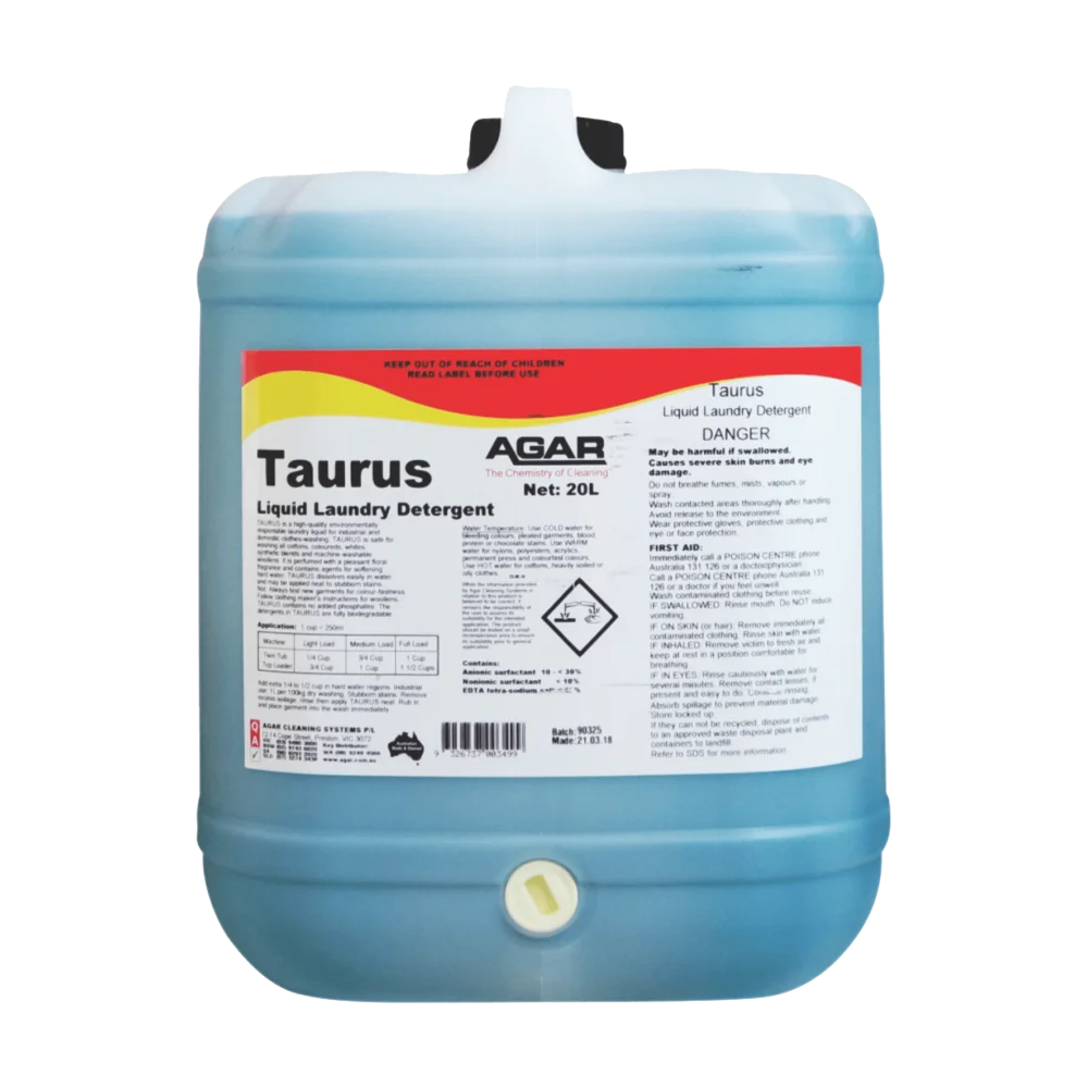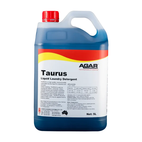 TAURUS is a high-quality environmentally friendly laundry liquid for industrial and domestic clothes-washing. TAURUS is safe for washing all cottons, coloureds, whites, synthetics and blends. It works in both hot and cold water. TAURUS may also be used to wash machine-washable woollen garments.