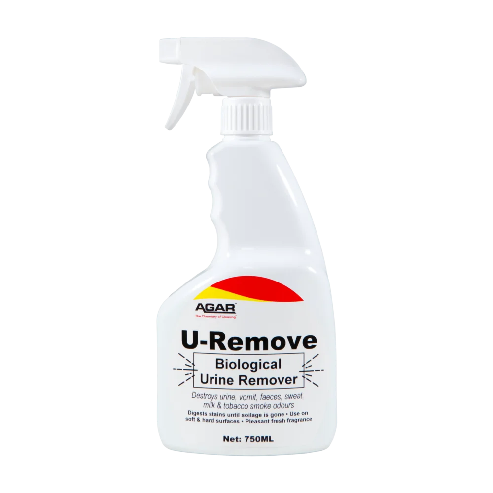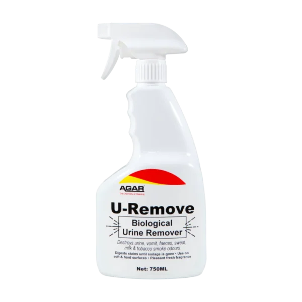 U-REMOVE is designed for use on carpets and fabrics but can be used on hard surfaces as well. Because U-REMOVE is biologically active, it must not be mixed with disinfectants, sanitisers, hot water or strong chemicals as these materials will deactivate the good bacteria that are present and needed for the product to work.