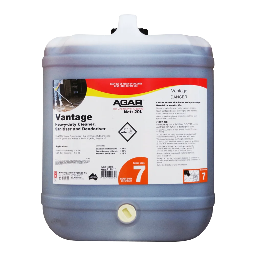 Vantage will remove a wide variety of soilage including spillages, foodstuffs, drinks, dirt and tough soil residues from all washable hard surfaces. It is ideal for use on floors, walls, bins, benches, tiles and stainless steel.
