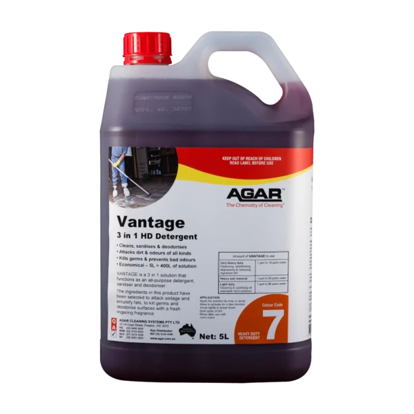 Vantage is a 3-in-1 product that functions as a detergent, sanitiser and deodoriser. The ingredients in this product have been selected to attack soilage and emulsify fats, to kill germs and deodorise surfaces with a fresh perfume.